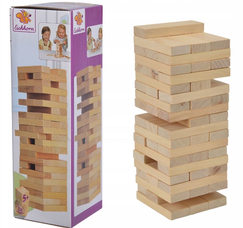 Jak wysoką wieżę uda Ci się zbudować zanim runie? Delikatnie wyciągaj drewniane klocki i układaj je na górze, aby wieża pięła się wzwyż! Im więcej elementów wyciągasz, tym bardziej staje się chwiejna. Przegrywa ten, kto zburzy wierzę. Czy uda Ci się pokonać grawitację?
