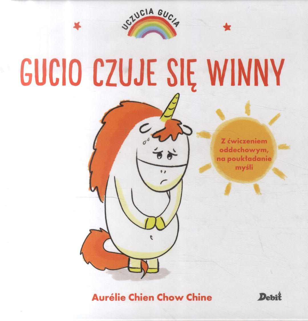 Gucio to mały jednorożec taki jak wszystkie. Albo prawie… Jego tęczowa grzywa zmienia kolor zależnie od tego, co Gucio odczuwa. Dziś Gucio czuje się winny. Zrobił głupstwo i nie śmie wyznać tego mamie, ponieważ boi się bury. Zobacz, w jaki sposób uda mu się odzyskać dobry humor! Seria historyjek, które uczą nazywania emocji i panowania nad nimi. W każdej książeczce opisano jedno uczucie. Na końcu historyjki znajdują się bardzo proste ćwiczenia, które pomogą dziecku wyciszyć się i zapanować nad emocja